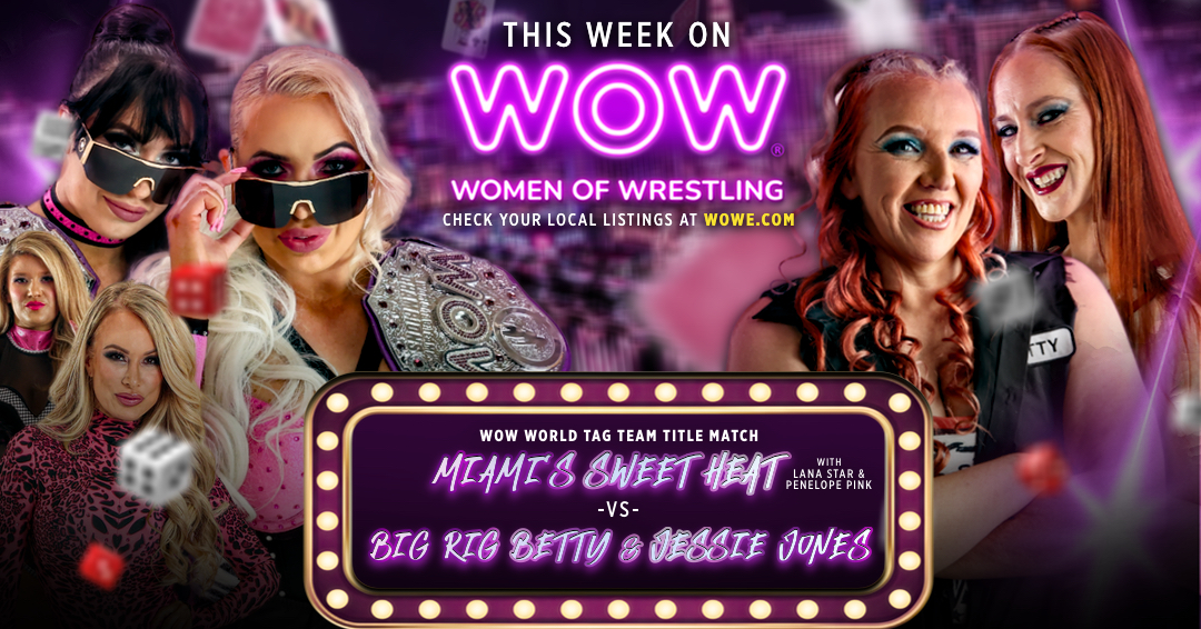 It’s showtime! The WOW roster has moved to the Entertainment Capital of the World, Las Vegas, Nevada to bring you non-stop action on the most iconic street in the world: The Fremont Street Experience! Top Tier’s Kandi Krush kicks off this Vegas spectacle in a singles match against all-star athlete Ashley Blaze. And in the Main Event, it’s Miami’s Sweet Heat’s first tag team title defense since the infamous Tag Team Championship Cage Match. The 5 time WOW World Tag Team Champions defend against former champions themselves, Jessie Jones and Big Rig Betty! Will the Southern brawlers be able to claim revenge for the Fab Four’s vicious plot against Holly Swag? Find out, only on WOW!